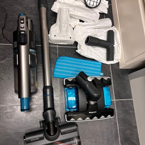 Philips 8000 Series SpeedPro Max støvsuger med trådløs funksjon. Inkluderer flere tilbehør for rengjøring av ulike overflater. Man kan vaske og støvsuge i én omgang/samtidig. Esken følger med