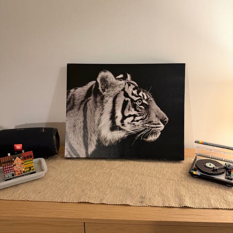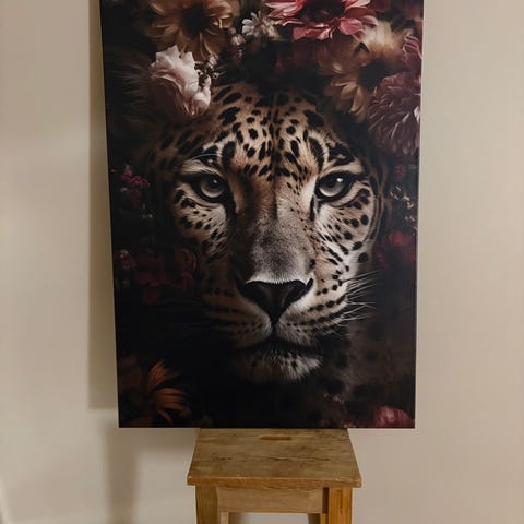 Pent canvas med flere enheter som utgjør bilde av en ulveflokk. Høyeste bildet er 55cm langt, total bredde er 103cm uten mellomrom mellom bildene.