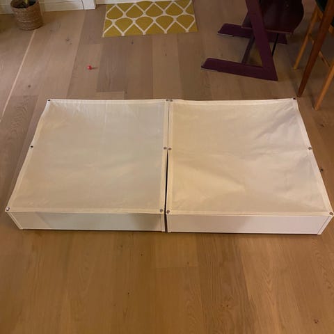 En smart løsning for små rom. Denne sengeskuffen gir plassen under senga til et sted hvor du kan ha ting som dyner, puter eller klær til ulike årstider. Tekstillokket holder hybelkaninene unna.