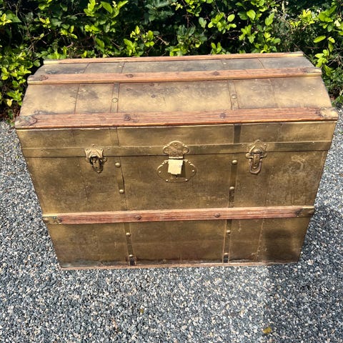Gammel, nostalgisk koffert med metallbeslag og håndtak på sidene. Kisten har et robust design med låsemekanisme foran og forsterkede hjørner. Egnet for oppbevaring av diverse gjenstander. Mål: ca. 78x50x50 cm