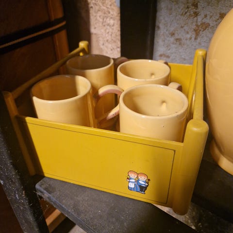 Lang og dekorativ retro boksrekkei gul/oker/beige fargetone.