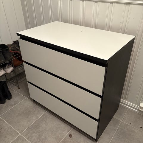 IKEA malm kommode i hvit farge. Kommoden har flere skuffer for oppbevaring og et enkelt, funksjonelt design. Den er noe slitt og gis derfor bort.