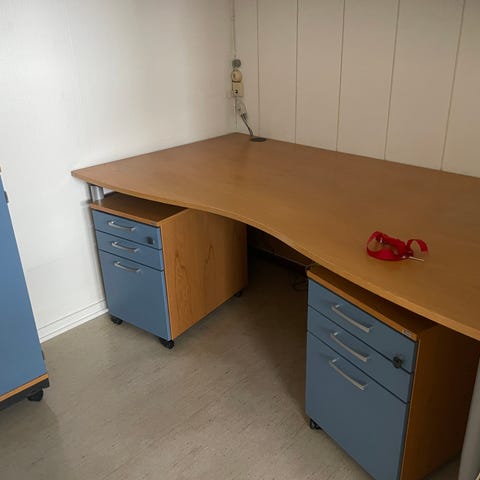 Skrivebord for hjemmekontor med lys trefinish. Inneholder flere oppbevaringsmuligheter inkludert skap med hyller og uttrekkbar hylle. Passer til kontorbruk med god plass til arbeidsutstyr og dokumenter. Kan hentes på Kolsås