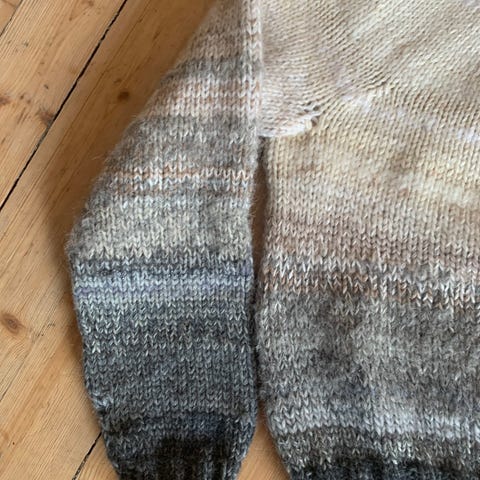 Rosendal-genseren som ble designet i 1990 er populær igjen, etter å ha blitt brukt av Ben Ward i «Der ingen skulle tru at nokon kunne bu». Jeg strikket den sikkert på j90-tallet, men den er lite brukt, og derfor så god som ny. Bedre at noen bruker den, enn at den bare blir liggende i skapet . Husker ikke garntype, men det er 100% ull. Det er størrelse M/L vil jeg tro.