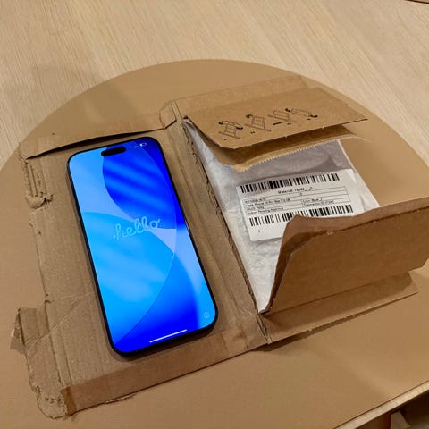 Telefonen ligger i esken med orginalt tilbehør og kvittering.