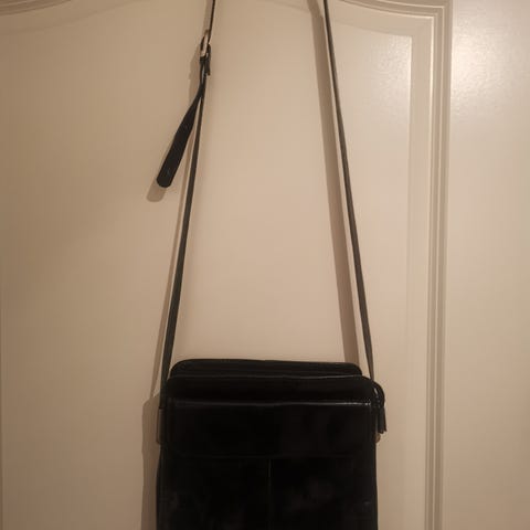 Lekker åleskinn veske i sort. Pent brukt, skulderstropp/hånd veske. Glidelås lomme inne i. 28 cm bred og 19 cm høy.
