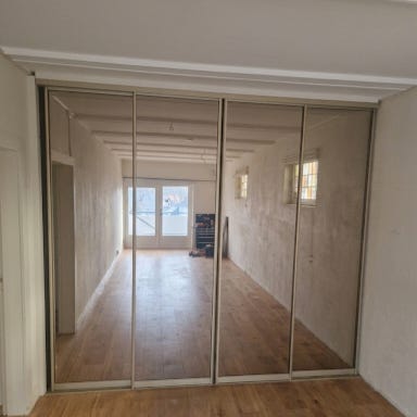 Selger 4 stk skyvedører til med skinner. Høyde er ca. 238, mens lengde er ca 291. Originalt furu som er malt med hvit. To av dørene har speil.