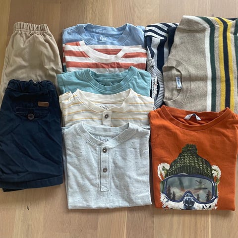 KappAhl gensere for gutt i størrelse 110/116. Flere gensere med ulike stripemønstre og ensfargede varianter i blåtoner. Laget for barn, egnet til hverdagsbruk.