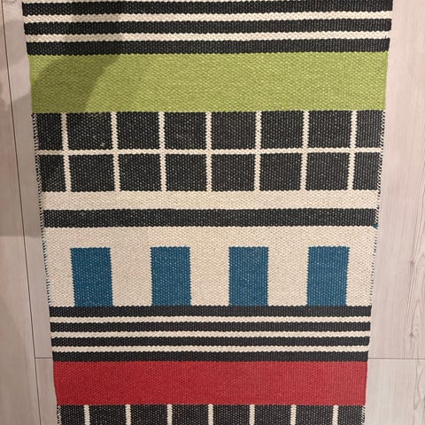 Selger et flott og slitesterkt Pappelina‑teppe i størrelsen 70 × 220 cm. Teppet er vendbart med grønt/mosegrønt mønster på den ene siden og lysegrønt/creme på den andre – perfekt hvis du liker å variere uttrykket.