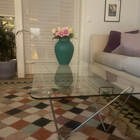 Sofabord med glassplate og metallramme. Bordet har et rektangulært design med synlige metallfester på toppen av bena.