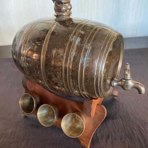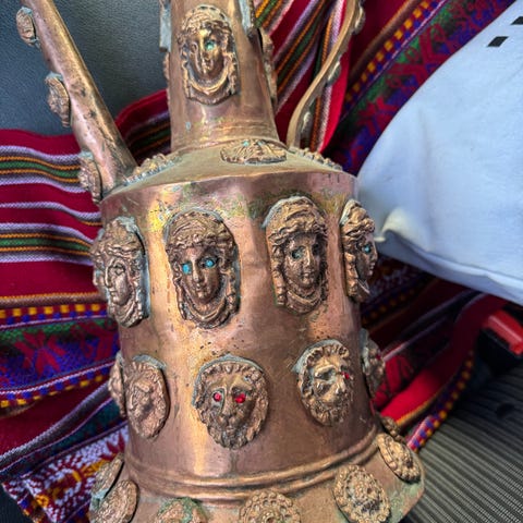 Messing vannkanne med dekorative løvehoder på sidene og buet tut. Håndtaket har et treinnlegg for bedre grep. Kannen har en rund fot og en vid åpning for enkel påfylling. Egnet til dekorasjon eller servering.