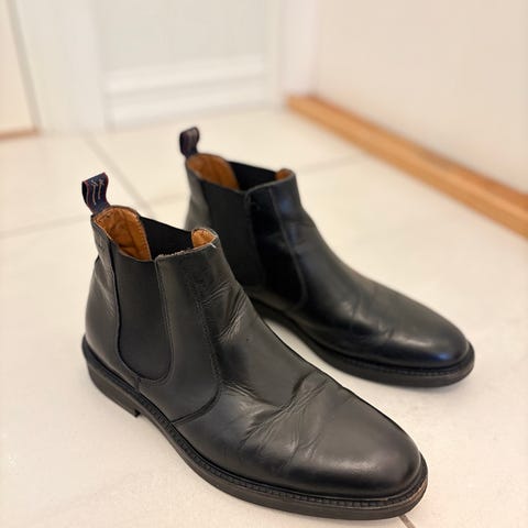GANT chelsea støvler i størrelse 42, laget av svart skinn. Støvlene har elastiske sidepaneler for enkel på- og avkledning.
