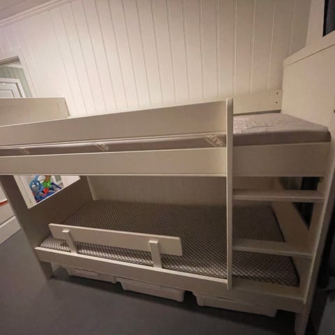 Køyeseng fra Jollyroom / Hoppekids i hvitmalt tre. Praktisk seng som passer godt på barnerommet. Mål: 166 cm lengde, 76 cm bredde, 140 cm høyde.