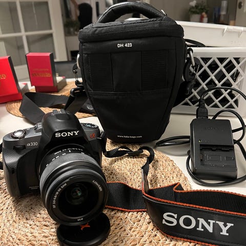 Sony A290 speilreflekskamera med utskiftbart 18-55 mm objektiv. Kameraet leveres med tilbehør som batterilader, kameraveske med skulderrem og bruksanvisning.