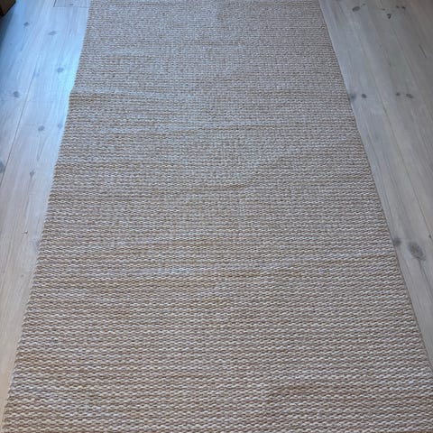 Selger to pene og vendbare Pappelina‑tepper i klassisk nordisk stil. Begge har grafiske mønstre i sort og offwhite, og kan brukes på begge sider (inverterte farger). Perfekt til gang, barnerom, vaskerom, baderom eller foran ytterdøren.
