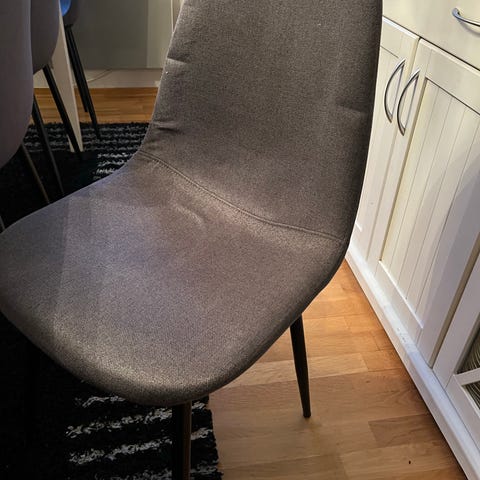 Stolene har grått stofftrekk og sorte metallben, og passer godt rundt både moderne og klassiske spisebord.