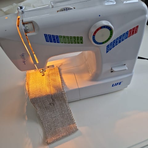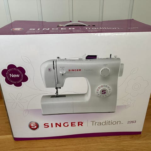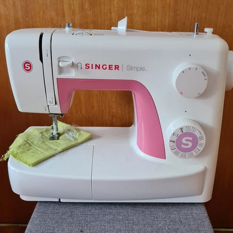 Singer Simple symaskin i hvit farge. Maskinen har grunnleggende funksjoner for søm og er egnet for enkel til middels sying. Den har et kompakt design med innebygd oppbevaringsrom for tilbehør.