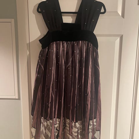 Skjørtet har justerbare knapper på innsiden slik at lengden kan tilpasses. Sløyfen bak kan tas av og på.