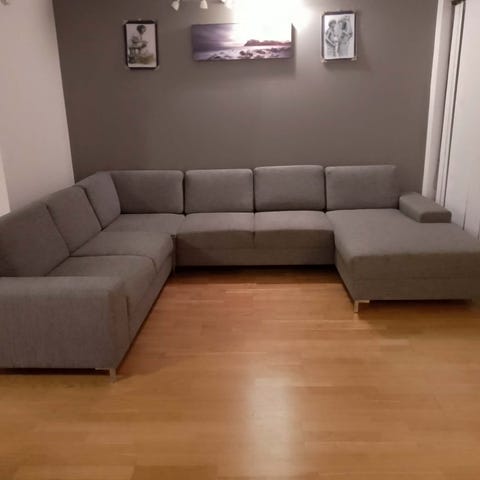 Selger min pent brukte hjørnesofa med sjeselong i svart velour kjøpt på Fagmøbler rundt 2020, da jeg ønsker å gå over til en mindre sofa.