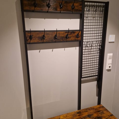3-i-1 kleshenger Kleskroker, en skobenk og en skohylle – denne alt-i-ett multifunksjonelle oppbevaringsenheten i gangen passer alene alle dine behov for å henge klær, organisere sko og sette seg ned for å ta på eller ta av skoene .