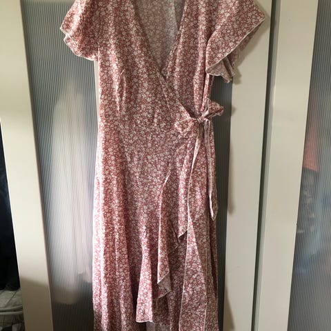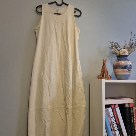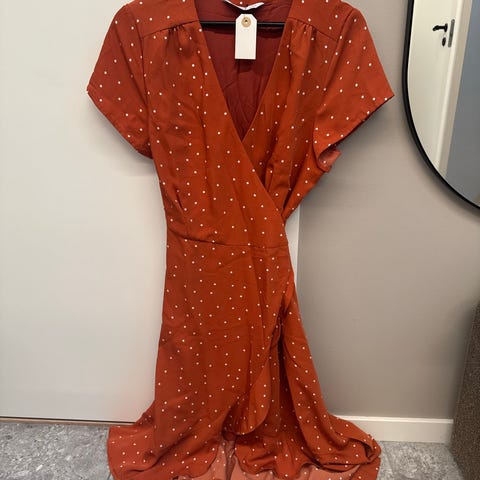 Uniqlo sommerkjole i størrelse M for kvinner. Kjolen er brun med et mønster av hvite prikker og laget av polyester.