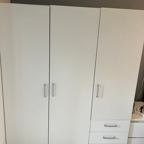 Romslig hvitt garderobeskap med 5 skuffer og garderobestang. Håndtak i stål.