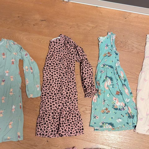 7 kjoler, 4 bukser, 1 skjørt, 1 bluse/tunika for størrelser 140-150. Som ny