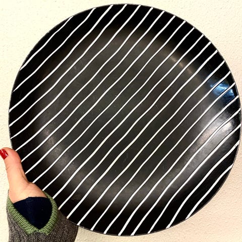 Det er dekorert med et bånd av kobber- eller gullfarget mønster rundt midten.