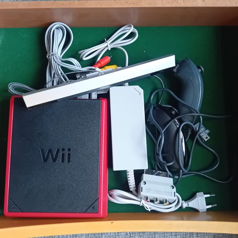 Nintendo Switch konsoll med tilbehør inkludert Zelda bæreveske og tre spill: Captain Toad: Treasure Tracker, Cars 3: Driven to Win, og Pokémon DX . Konsollen leveres med dokkingstasjon, ladekabel 2Joy-Con holdere men ingen joy cons og ratt