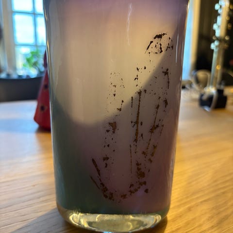 Dekoren i glasset er laget med sentrifugering. Ved å legge til farge i prosessen, i dette tilfellet svart, gis det et inntrykk av tåkeaktig fargevirvler i glassmassen. På den måte er hver gjenstand helt unik.