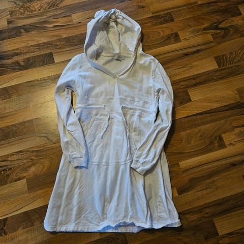 Pent brukt. Hvit kjole med halvlange ermer og broderidetaljer på V-halsen. Sammensetning: 100 % viskose. Nypris 700,- Lengde midi