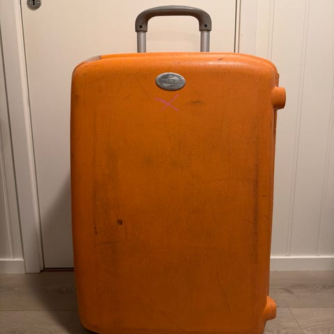 Selger en Samsonite koffert i håndbagasje størrelse (55x38x19 cm). Fin lilla farge. To store stødige hjul som gjør at kofferten triller lett. Noen bruksmerker i plastikken, men for øvrig «hel og pen».