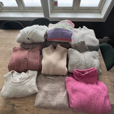5 gensere brun, rød, orange, 2 svart/hvit stripet, svart med rosa trykk