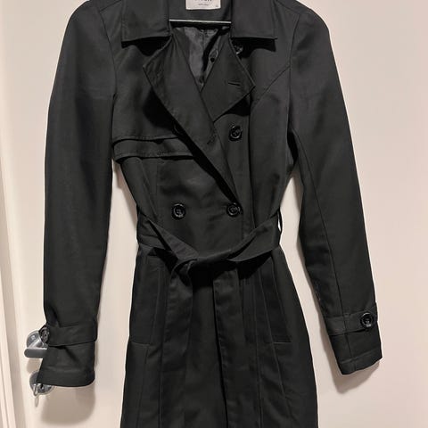 Selger en elegant og tidløs mørkeblå trenchcoat i klassisk snitt. Kåpen har en feminin passform med markert midje og knytebelte, samt beltedetaljer på ermene. Den faller pent og har et stilrent uttrykk som passer både til hverdags og mer pyntede anledninger.