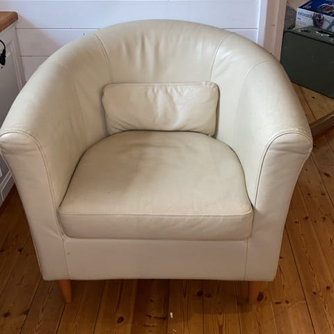Komfortabel lenestol i ekte skinn, lys creme/off-white farge. Klassisk club/tub-form som passer godt i stue, kontor eller soverom.