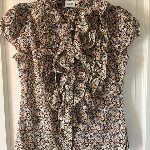 Saint Tropez Bluse i størrelse M, beige farge med små prikker, laget av polyester. Blusen har rysjedetaljer foran og kort erm.