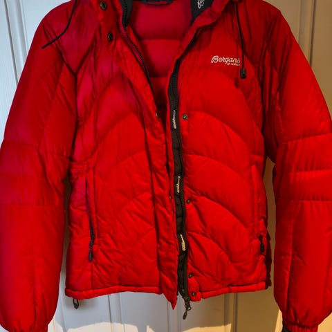 Jakken er svart og laget med dunfyll, som gir isolasjon og varme. Designet for kalde værforhold med en hette og justerbar nederkant.