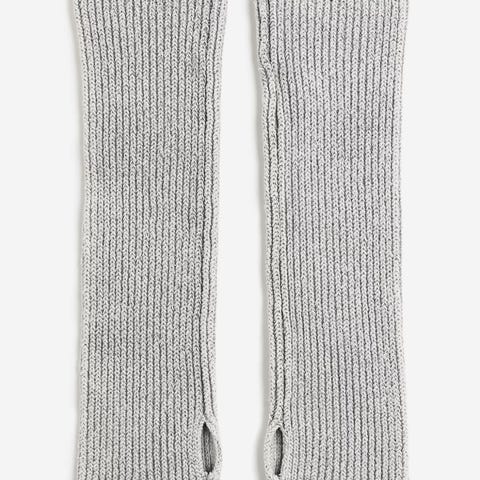 Et par myke, ribbestrikkede pulsvarmere med tommelhull.