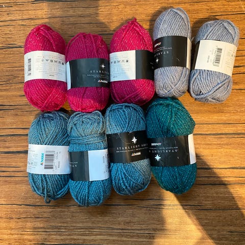 Starlight Hobbii garn med 64 meter per 100 gram nøste. Materiale består av 60% ull, 25% polyamid og 15% reflekspolyester. To nøster i grå, et i mørk blå (hvor det er brukt 4gram) og to hvite samt en rest. Veldig fint å strikke refleksluer av dette garnet, særlig til barn.