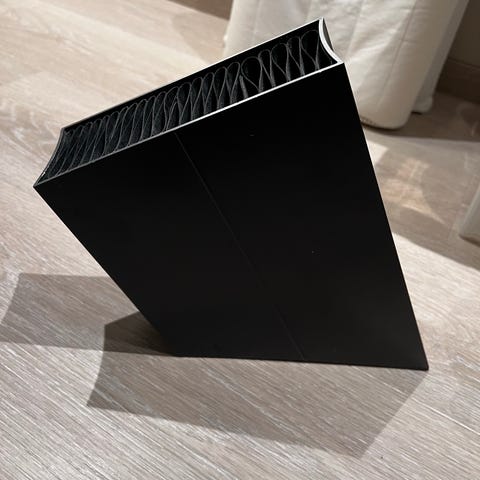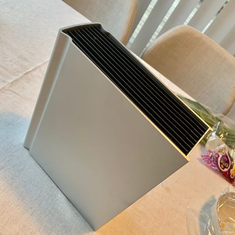 Hvit, solid knivblokk. Står stødig og godt, og gjør knivene lett tilgjengelig. Ville valgt denne modellen igjen, men selges da vi har fått metall-oppheng til knivene.