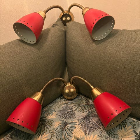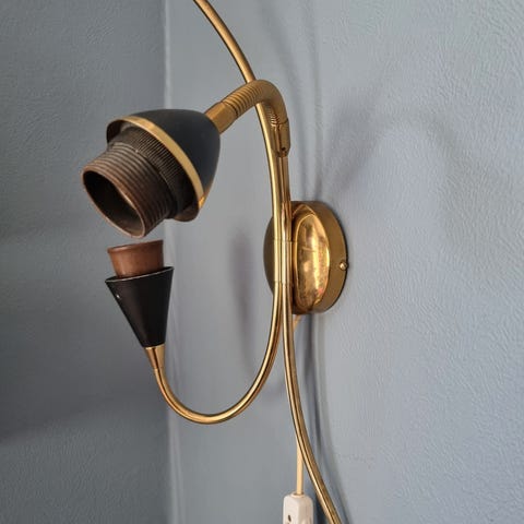 Liten vegglampe satt sammen av deler i messing fra to ulike lampetter og en nydelig liten lampekuppel med gulldekor som en gang var en del av en taklampe. Metall-delene er ganske blanke og fine, kuppelen har et par små nagg langs kanten. Nyere type ledning med bryter og flatt støpsel som passer i både jordede og ujordede kontakter. Bakplaten er 10 cm i diameter, lampen bygger ca 16 cm ut fra vegg, selges uten lyspære. Dekorativ 🤩