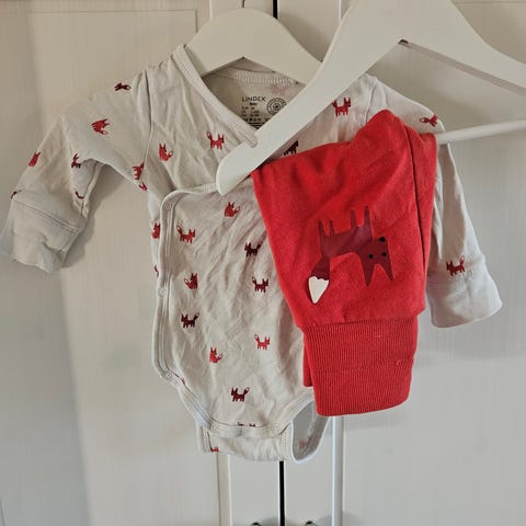 Kjempesøtt sett fra Lindex med body (extended size, dvs ekstra knapperad i skrittet som forlenger brukstiden), og bukse med revemotiv på ene beinet og på rompa. Pent brukt uten anmerkninger.