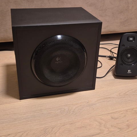 Logitech Z906 Surround Sound Høyttalersystem med 5.1-kanals konfigurasjon. Systemet inkluderer fem satellitthøyttalere og en subwoofer, og er designet for å gi surroundlydopplevelse.