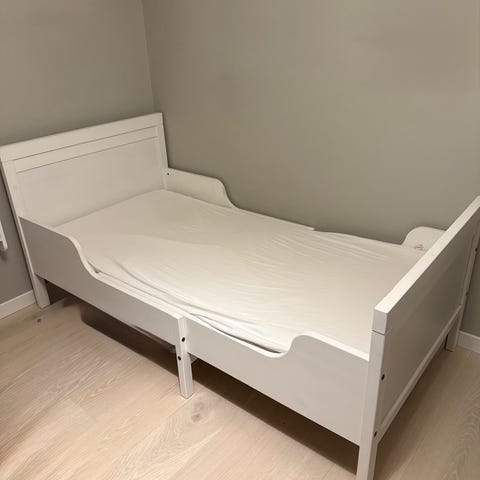 Godt brukt, med bruksmerker og blyantmerker på den ene siden, men mye bruk igjen. Kan trekkes ut til enkeltseng 200cm.