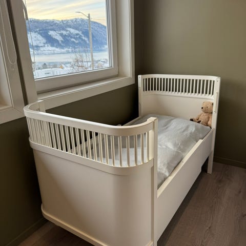Sebra sprinkel og junior-seng, i hvit. Sengen kan trekkes ut og bli en junior seng. Madrass følger med, trekket kan vaskes.