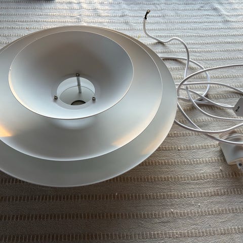 Dyberg Larsen bordlampe i hvit farge. Lampen har en rund skjerm og en enkel, stilren design. Egnet for bruk som bordlampe i ulike rom. 45 cm høy. Pent brukt. Selges 375