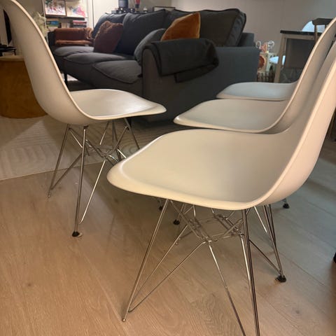 Tre hvitmalte stoler i tre selges, helst samlet. Hyggelige stoler hjemme eller på hytta. De har litt merker i malingen ytterst på armlener, se bilde. Sittehøyde er 37 cm. Puter, ikke originale er 7 cm tykke og kan kjøpes i tillegg for 40,- per stk. Pris per stk for to av stolene er 250,-. En stol er skadet, se bilde, den selges derfor for 100,-. Samlet pris for alle tre stoler er 600,-, med puter 700,-