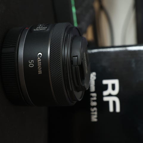 Canon RF 50mm objektiv. Standardobjektiv med fast brennvidde på 50mm, egnet for ulike typer fotografering. Kompatibelt med Canon kameraer