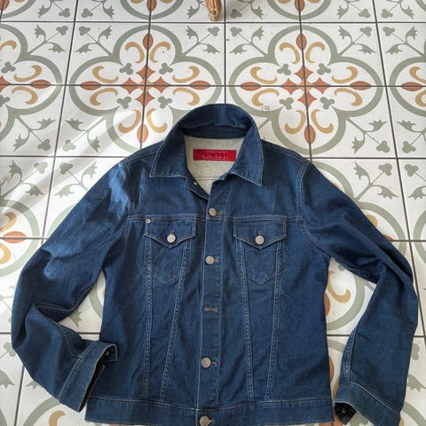 Jakken har klassisk denimdesign med knappelukking, side- og brystlommer. Den har ingen bruksmerker eller skader.