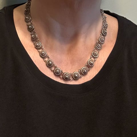 Jeg har arvet brosjen etter min mor, som er fra Telemark. Hun fortalte at den ble kjøpt på begynnelsen av 1960-tallet, men husker ikke lenger hvor.